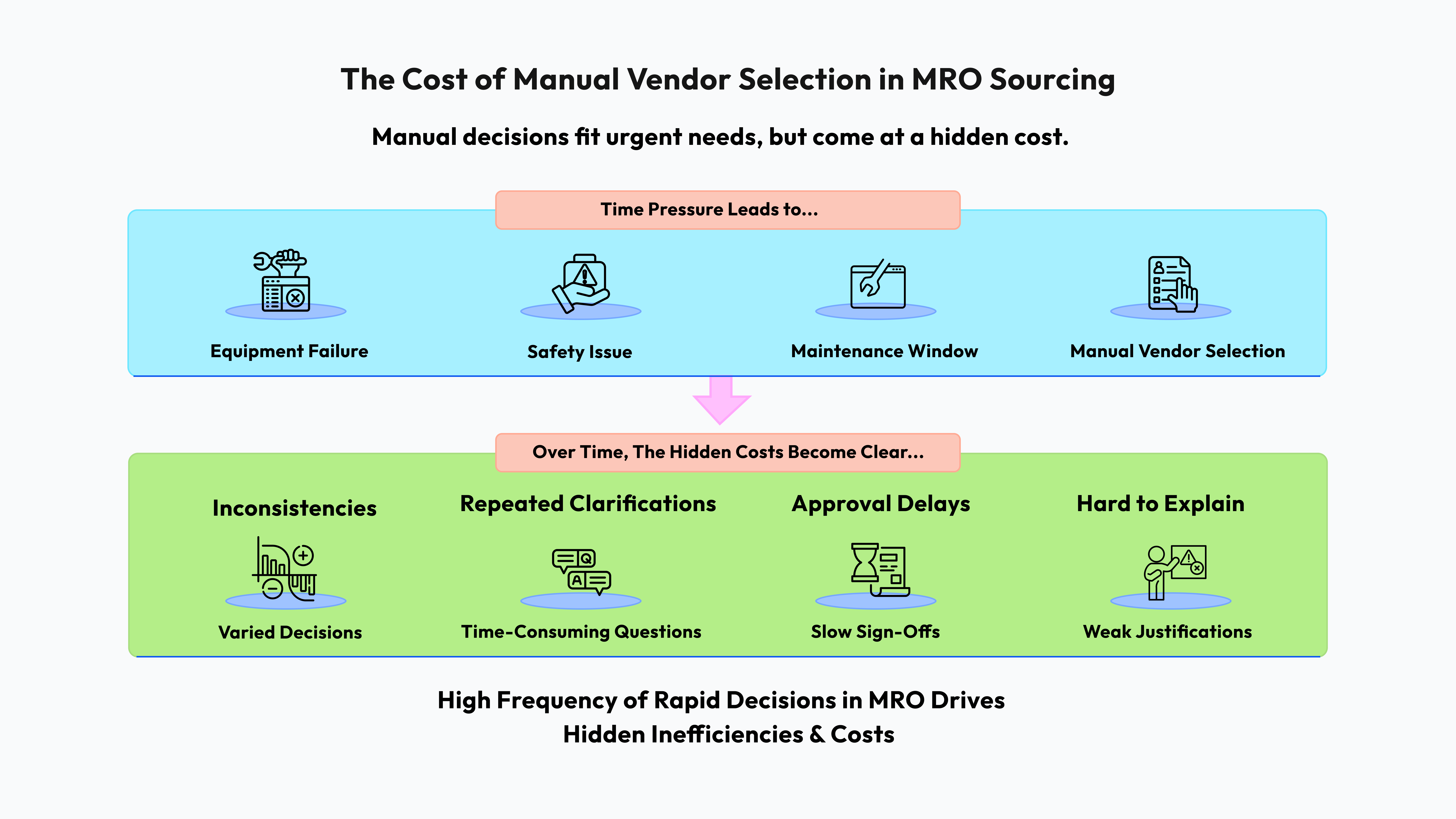 MRO sourcing decisions frequently happen under time pressure. Equipment failures, safety issues, and maintenance windows shorten timelines and reduce options. Vendor selection is made swiftly to restore operations, instead of running a full sourcing exercise.