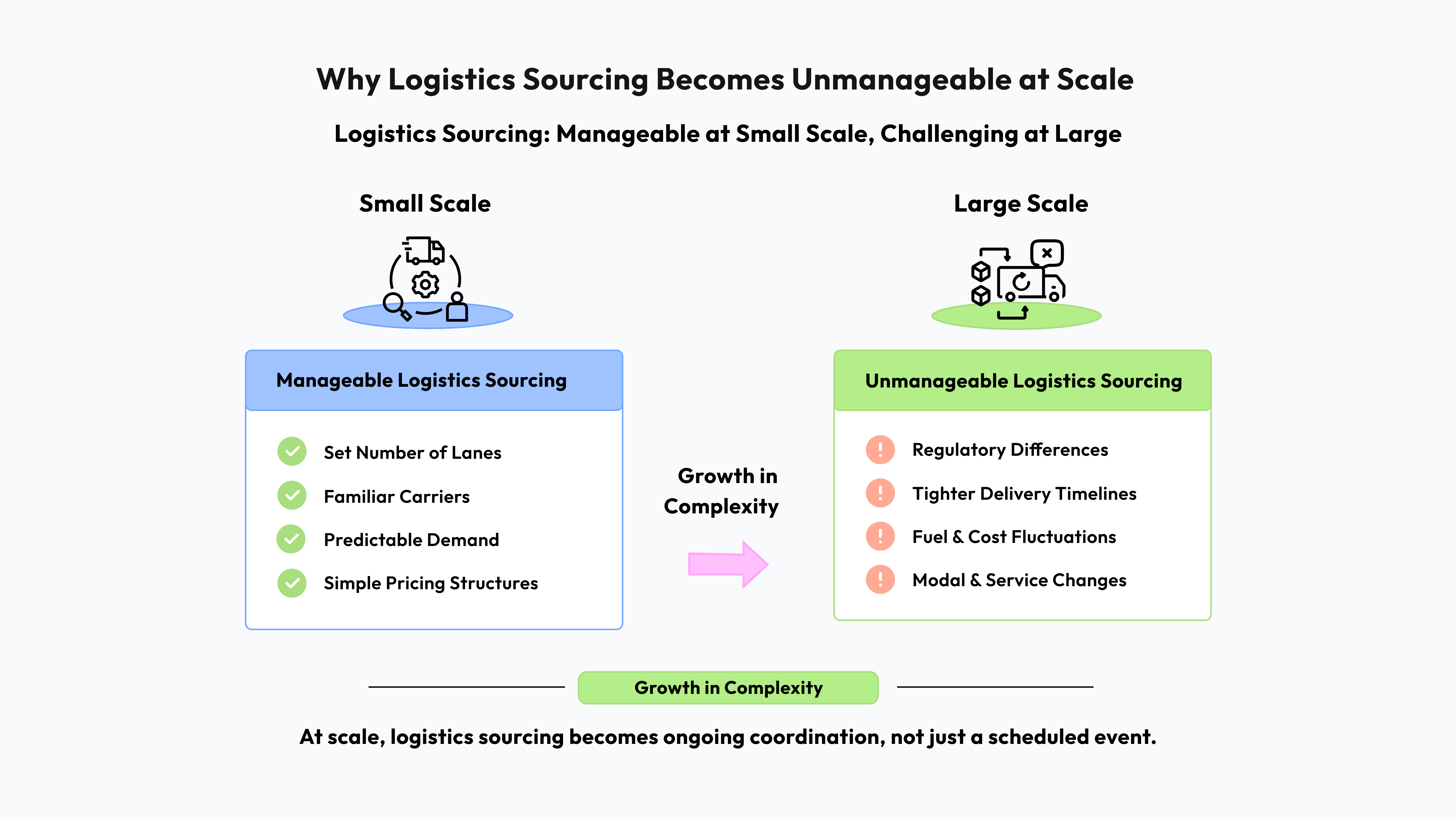 Logistics sourcing at scale can remain manageable - if the frameworks for decision-making mature alongside network growth. When structure keeps pace with scale, coordination and outcomes improve. Without it, sourcing becomes unwieldy and difficult to manage.