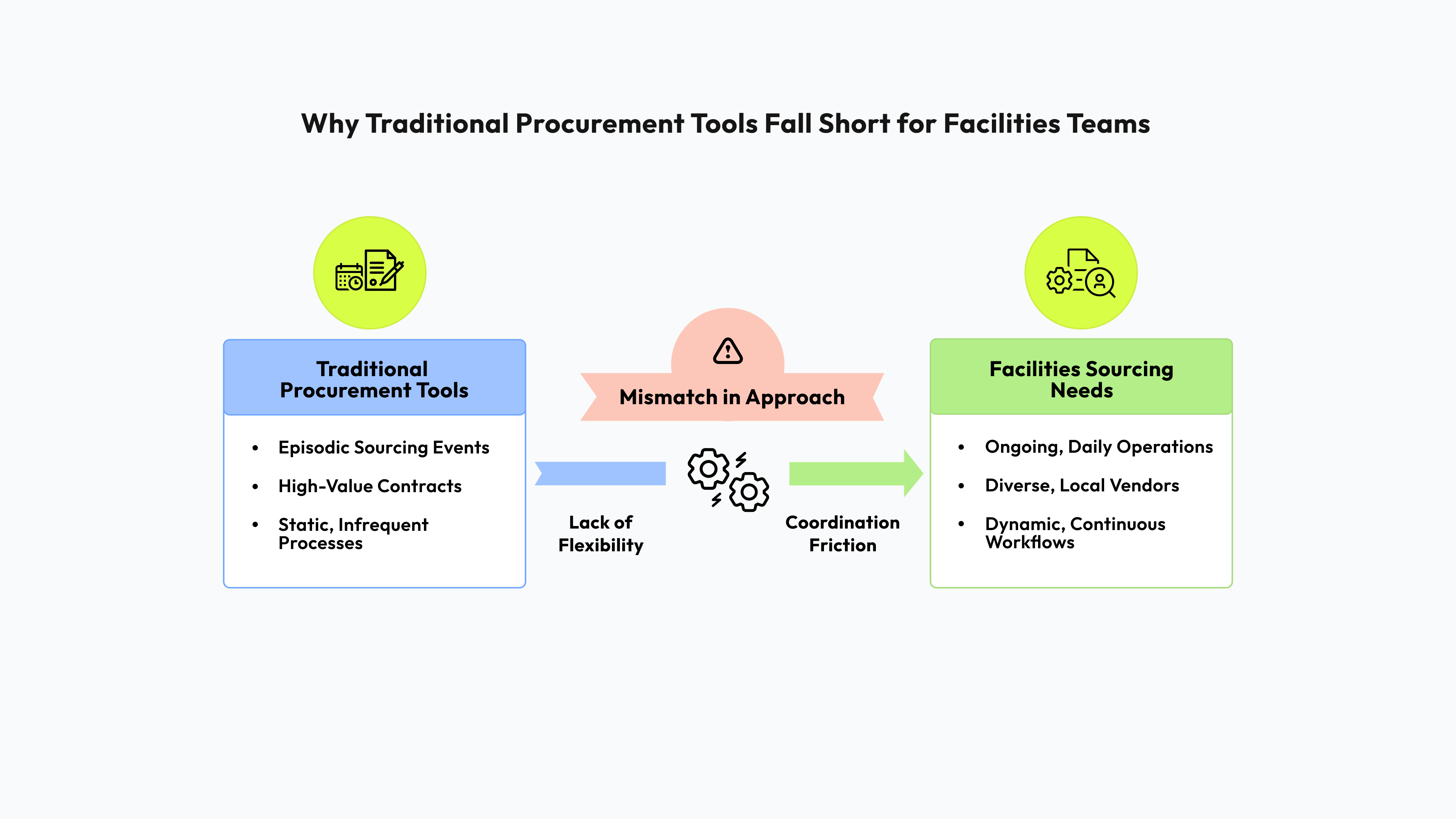 This mismatch creates friction. Not because facilities teams lack discipline or effort, but because the tools they rely on were not built for how facilities sourcing actually works at scale.